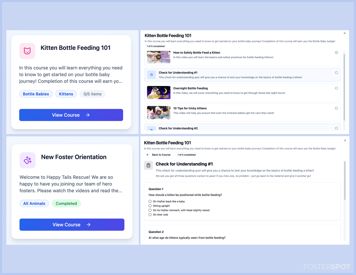 Currently, after fosters complete our video, they fill out a short Google Form quiz to confirm they've watched it. We then follow up with a phone call to review a few additional points and answer any final questions before they begin fostering.