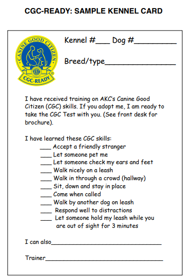 The kennel cards would help the volunteers and staff to reinforce the behaviors that the dog already knows. It is a check list of the test items for CGC. We found that if all handlers are consistent with reinforcing cues the same way, it works very well for shelter dogs. We had success with this for the 6 months we were doing this. Each week we added another cue/test item that we trained with the dog for everyone to continue to work with dog each time the dog was taken out of the kennel. That way it is not overwhelming for shelter staff and volunteers.