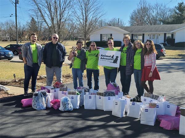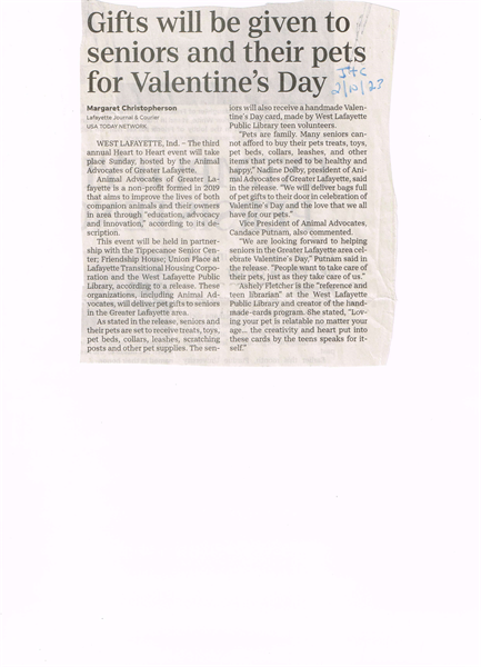 homelessness, and a low-income housing complex. I have attached pictures and a news article here. We also partner with a teen program at a local library, and the teens make cards for the seniors. We are a very small, all volunteer organization, and served about 40 families this Valentine's Day. This event, now in its third year, has been great for outreach, publicity, and connecting with donors. You can always email us at animaladvocatesgl@gmail.com for more information. Our website is linked below the photos.